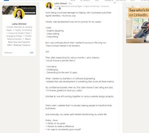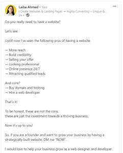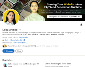 Laiba has top-notch website design skills but 3 months ago she was confused about her offer and had no clarity about LinkedIn. Today she’s getting qualified leads, potential opportunities, and growing her network consistently.